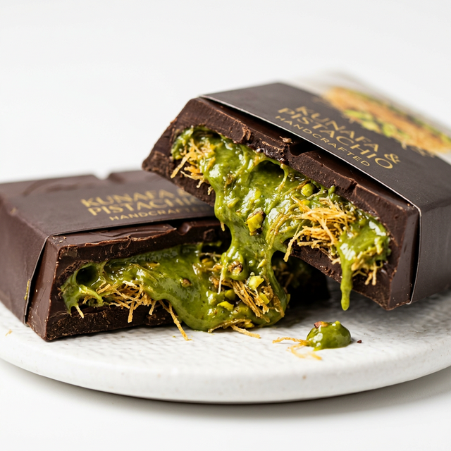 El chocolate viral de Instagram. Relleno cremoso de pistacho y un toque crujiente de kunafa. Edición Limitada.